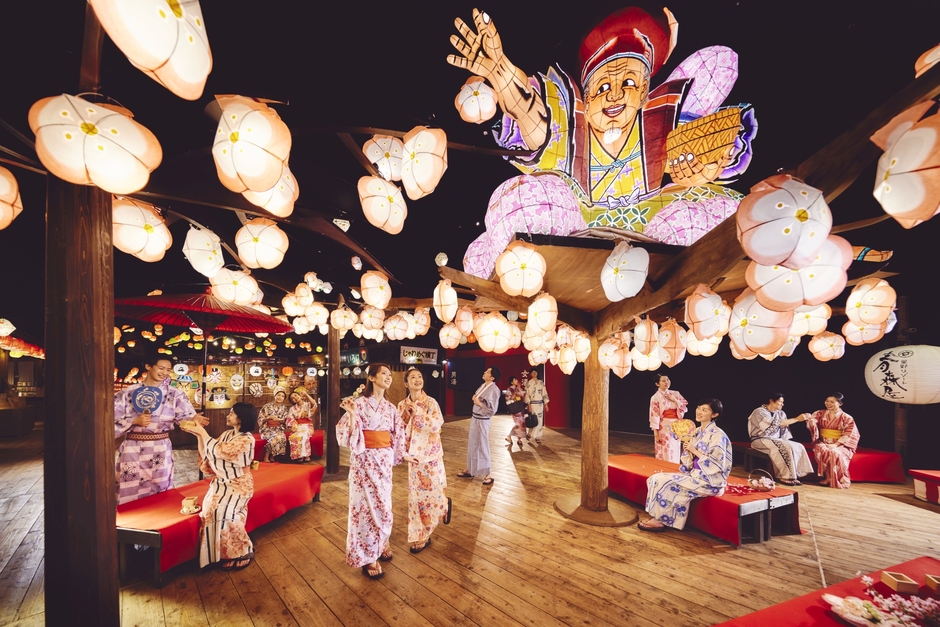 青森の文化を満喫できる宿「星野リゾート 青森屋」では、2022年4月1日から5月31日までの間、青森の春の訪れを祝うイベント「たんげ(*1)花咲かまつり」を開催します。イベントシンボルとして登場するのは、桜の木の上にいる「ねぶた花咲かじいさん」です。館内は、花咲かじいさんが花を咲かせたように、花型の灯篭で装飾します。ほかにも、3種類の郷土菓子で作る花見団子が楽しめる「花咲か茶屋」や花見気分を盛り上げる「桜柄の浴衣」の貸出、花見酒を楽しめる「花見こたつ」などを実施します。