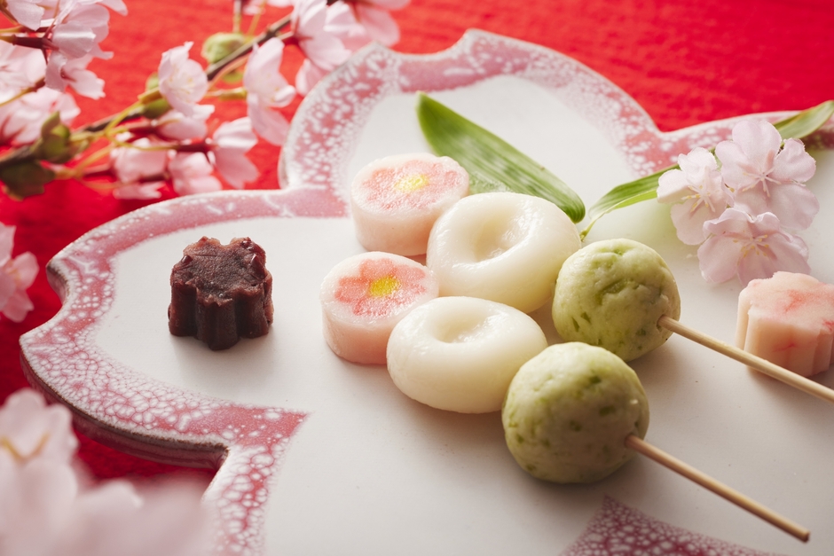 花見団子の三色は、緑色が雪の下に芽吹く新芽、白色が雪、ピンク色が春を迎えて咲く花を表しているといわれています(*4)。この三色を青森の郷土菓子で表現し、青森屋オリジナルの花見団子を提供します。