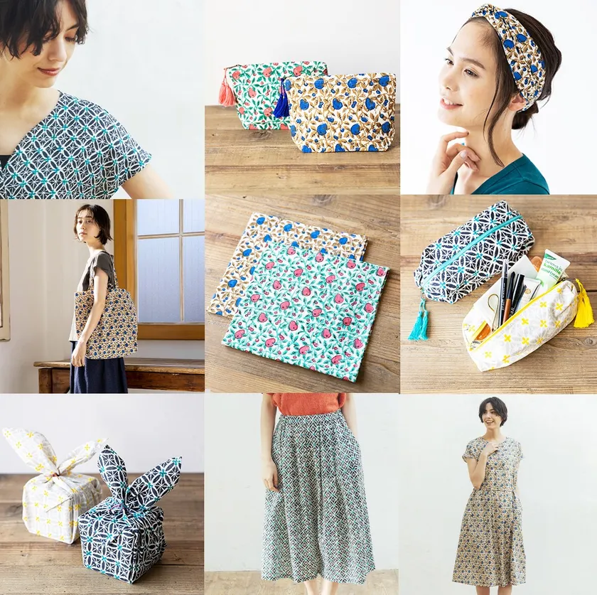 どちらの柄も、手彫りで模様を施した木版でインドの職人が手仕事でブロックプリントをした美しい配色のファブリックによるガーメンツや小物雑貨に生まれ変わりました。