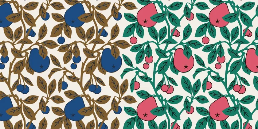 2種の果実をカラフルに描いた「ペアーズ&チェリーズ」は、1880年ごろデザインされた内装用テキスタイルをアレンジしています。原図はシンプルなラインが特徴的で、それを美しく生き生きとしたパターンに仕上げました。