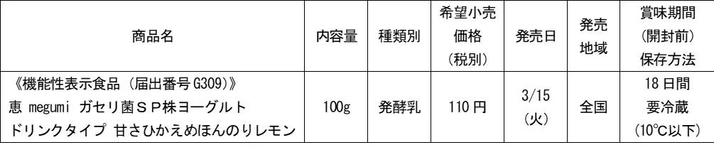 機能性表示食品「恵 megumi ガセリ菌SP株ヨーグルト」シリーズ 甘さひかえめタイプのドリンクが新登場! 「恵 megumi ガセリ菌SP株ヨーグルト ドリンクタイプ 甘さひかえめほんのりレモン」(100g)新発売! 2022年3月15日(火)より全国にて