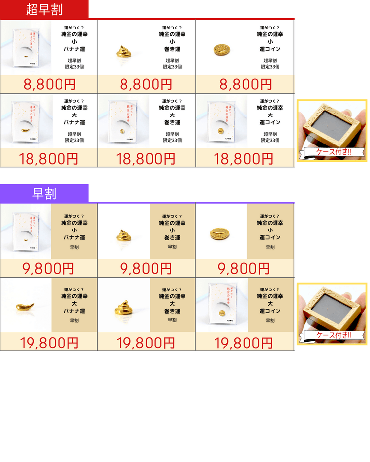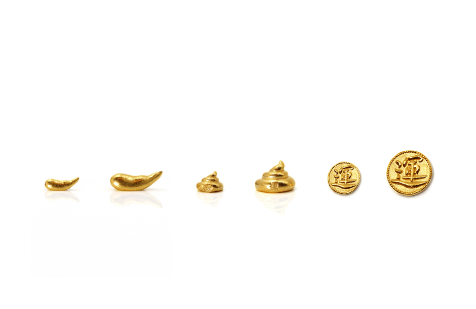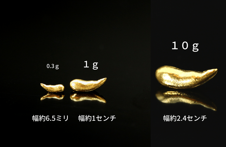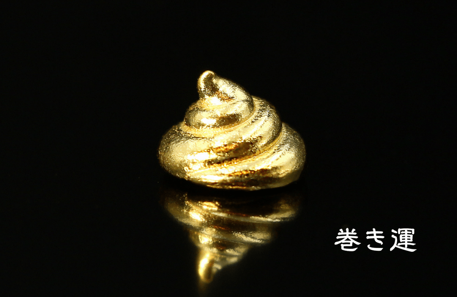 デザインは「バナナ運」「巻き運」「運コイン」の3種類、いずれも中空でもメッキでもない、無垢な本物の純度99.9%の金「純金」を使用しております。