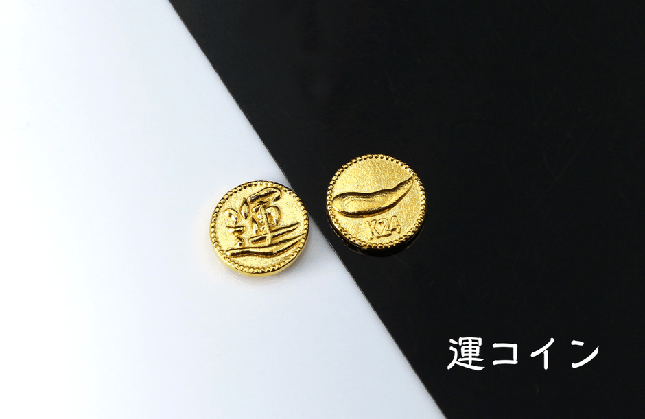 コイン自体が幸運をよぶアイテムであることに加えて、「運」の文字が片面に「バナナ形」がもう片面にデザインされている両面モデルです。
