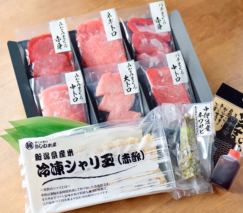 かしわ水産の匠が一押しする鮪の旨味をぎゅっと詰合せた計18貫分のお寿司セットは税込15,000円。かしわ水産オンラインショップ( https://www.kashiwasuisan.com/osushi/ )にて販売。