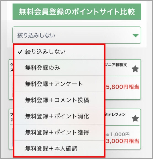 また、無料でポイントを獲得したい方も多いので「無料会員登録」の条件も付けています。