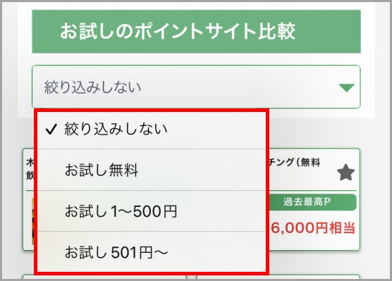お試しのカテゴリーでは「お試し無料」「お試し1~500円」「お試し500円~」の3つに条件を絞ることができます。