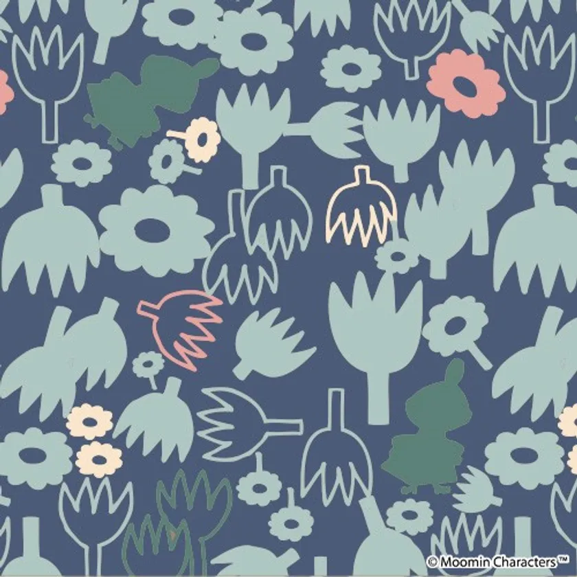 花柄のモチーフの中に、よく見るとさりげなく隠れるリトルミイのシルエットは、まるでお花畑の中でかくれんぼしているような、可愛らしいデザインです。総柄ですが、深みのあるブルーのベースなので、落ち着いた印象で着られます。