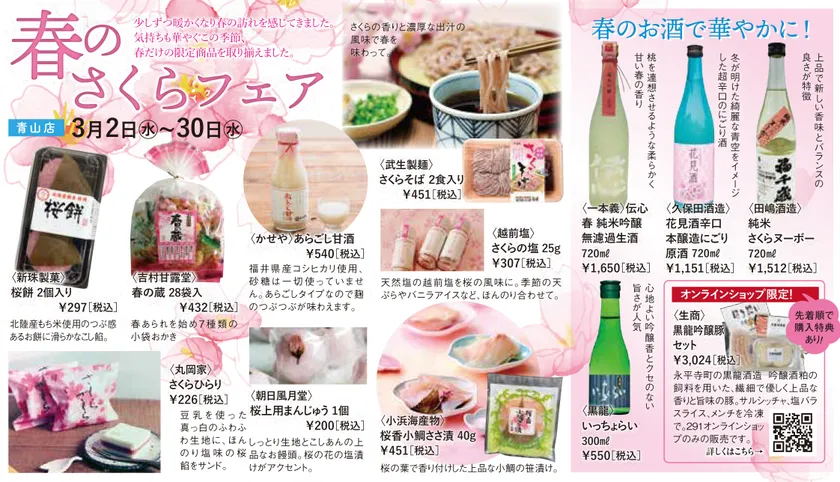 福井県アンテナショップの青山店「ふくい南青山291」では3月2日(水)から3月30日(水)までの期間「春のさくらフェア」を開催しております。