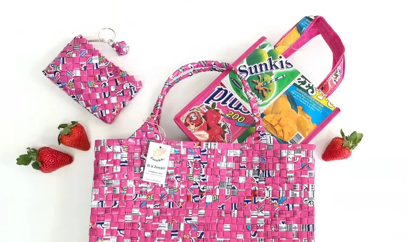 ジュースのパッケージを再利用したおしゃれでかわいいバッグ、平和を願う広島発の折り鶴をモチーフにした雑貨、紋付きの技術を活かした黒染めサービスなどSDGsにむけたメッセージ性のある商品やサービスが出展しています。
