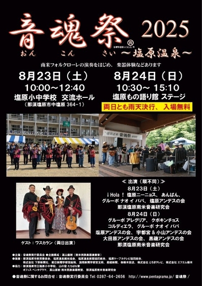 一般社団法人那須塩原市観光局(栃木県那須塩原市関谷448-4)は、南米音楽で夏を彩る恒例イベント「音魂祭(おんこんさい)2025 ~塩原温泉~」が2025年8月23日(土)・24日(日)に開催されることをお知らせいたします。23日(土)は塩原小中学校の児童による心温まるケーナ演奏を始め、24日(日)は栃木県内および近隣県から集まった南米フォルクローレ愛好家たちによる迫力ある生演奏を披露。アンデス地方の伝統音楽が持つ温かく切ない旋律とリズムを、塩原温泉の豊かな自然とともにお楽しみいただけます。両日とも入場無料、雨天決行です。