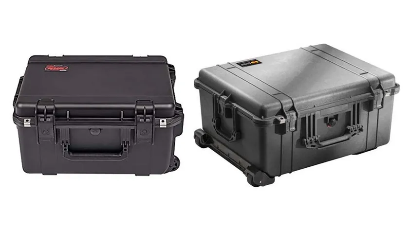 一式がすべて収まる、ハードケースが付属しております。写真の左側がWJ-TL19(SKB製)で、右側がWJ-TL22(PELICAN製)です。頑丈なケースですので伝票を貼るのみで運送業者による発送ができ、地方でのロケなどに最適です。キャスター付き。