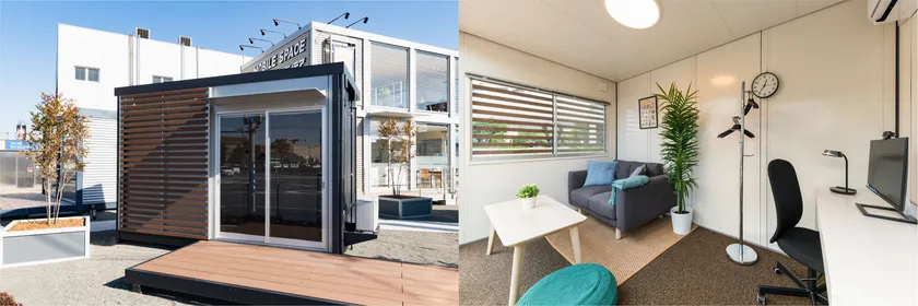そんな特長をもったモバイルスペースの体感型展示場が館林市に初出店しました。館林展示場では法人から個人の方まで幅広くご使用いただける、様々なサイズのモバイルスペースをご用意しております。