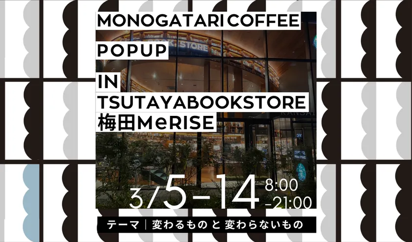 小説と珈琲が毎月届く体験型コーヒーのサブスク「ものがたり珈琲」を運営する、株式会社絆家(所在地:東京都板橋区、代表:平岡雅史)は、TSUTAYA BOOKSTORE 梅田MeRISEにてポップアップストアを開催いたしました。会場では3月のテーマ「変わるものと変わらないもの」に合わせたオリジナルブレンドコーヒーと小説家による書き下ろし小説を展示販売。