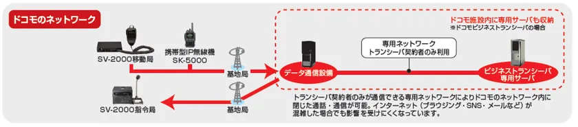 ・インターネットや専用線などには依存しないNTTドコモの通信インフラだけでIP無線システムの運用が可能なため、高いセキュリティや事業継続性の実現が可能。
