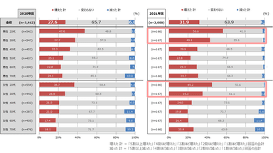 2017年と2021年の年代別回答を比較すると、60代以上の利用意向の上昇が顕著である。これはスマートフォンの利用率が、60代で39.4%から64.4%、70代で16.1%から35.6%へとそれぞれ上昇(*)していることなどから、スマートフォンでWebサイトを閲覧することがより一般化したことにより、QRコードへの好意度も上昇したのではないかと推察されます。