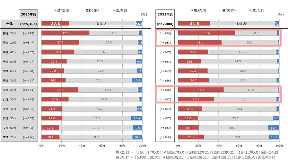2020年同時点と比較したDMの開封数ついての “増減認識” は。2020年と同様「増えた」と答える者が 「減った」と答える者を上回り、「増えた」と答える割合も2020年より増加している(表3)。 特に20~30代で「増えた」割合が高く、特に20代は男女ともに2020年より増えたと答えた割合が10ポイント近く増加している。