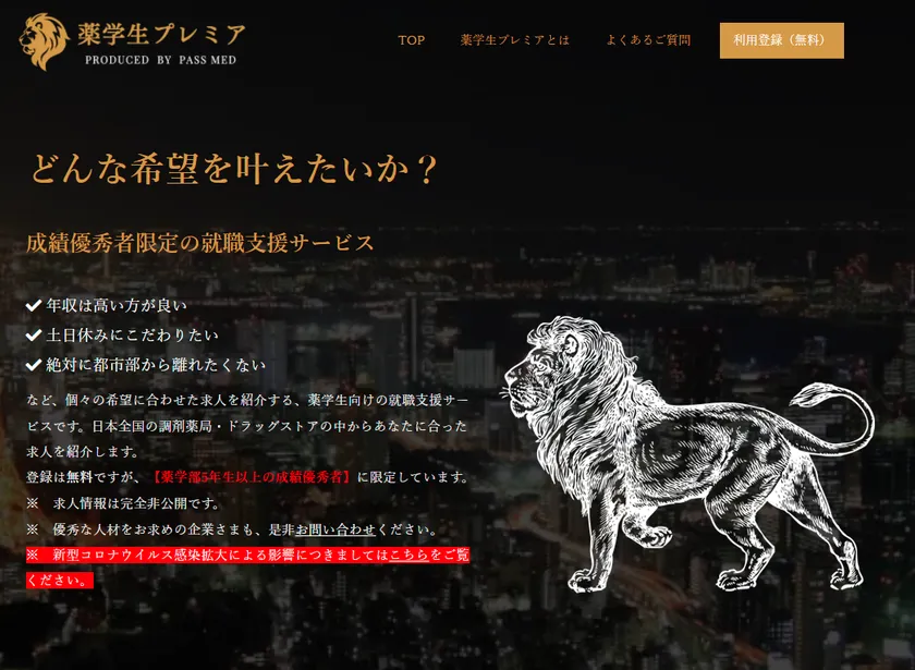 本サービスは就職活動中の大学5年生以上を対象としており、支援対象を「成績優秀者」に限定することで、薬剤師国家試験に不合格になる可能性が限りなく低い学生を薬局等の企業に斡旋しています。
