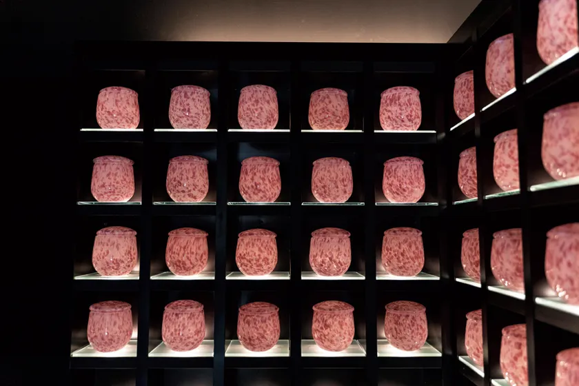 合同・個室納骨、分骨をお選びいただきます。観音さまの周囲に並ぶのは弘前にゆかりの深い桜をイメージした「津軽びいどろ」の分骨壺です。