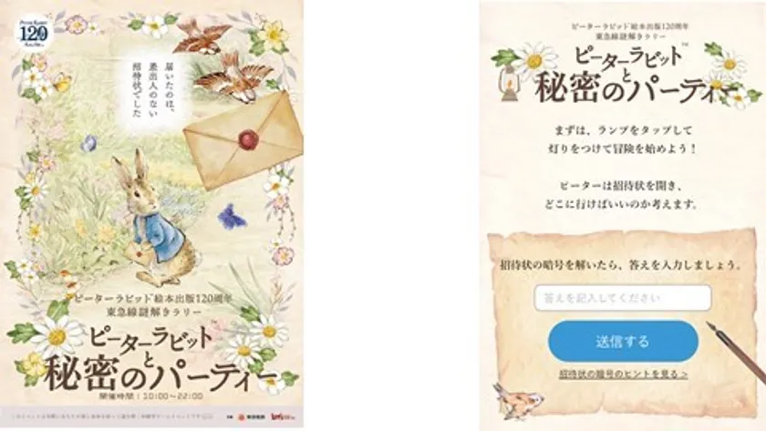 東急電鉄株式会社(本社:東京都渋谷区、代表:渡邊 功)と株式会社レッツエンジョイ東京(本社:東京都港区、代表:山口 伸介)は、株式会社ソニー・クリエイティブプロダクツ(本社:東京都港区、代表:大竹 健)、株式会社ハレガケ(所在地:東京都豊島区、代表:黒田 洋介)協力のもと、2022年3月26日(土)から6月30日(木)まで東急線沿線を巡るリアル謎解きゲーム『ピーターラビット(TM)絵本出版120周年 東急線謎解きラリー「ピーターラビット(TM)と秘密のパーティー」』(以下、「本イベント」)を開催します。