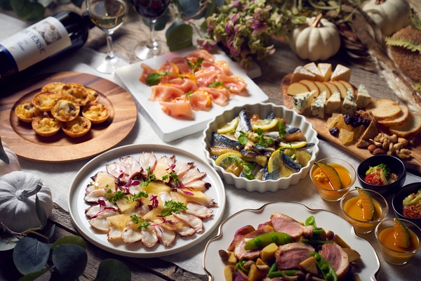 前菜は、"鴨スモーク さつまいもとキノコのスパイスの香り ハニーマスタード和え”、”かぼちゃのムース カルダモンの香り”や、旬の味わい”サンマと焼き茄子のマリネ”、“栗ときのこのキッシュ”など充実したラインナップ。ワイン好きの方には、チーズ、ナッツ、ドライフルーツなどのおつまみも豊富にご用意しております。