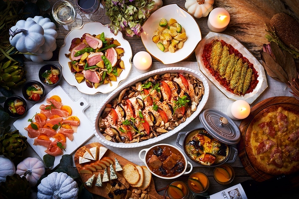 旬の食材が豊富なこれからの季節を存分に味わえるメニューをご用意いたします。ライブコーナーには、”ラム肉と春菊のピリ辛しゃぶしゃぶ”の食欲そそる香りが広がります。くり抜いたかぼちゃを丸ごとグラタンにした”ごろごろかぼちゃのクリームグラタン”や“秋鮭と茄子のオーブン焼き”、“松茸ご飯”など、食材の旨味をご堪能いただけるメニューはもちろん、ワインにぴったりの前菜やおつまみ、また女性に嬉しいスイーツも豊富に取り揃えております。