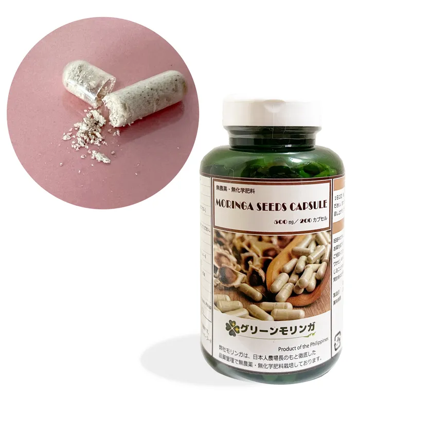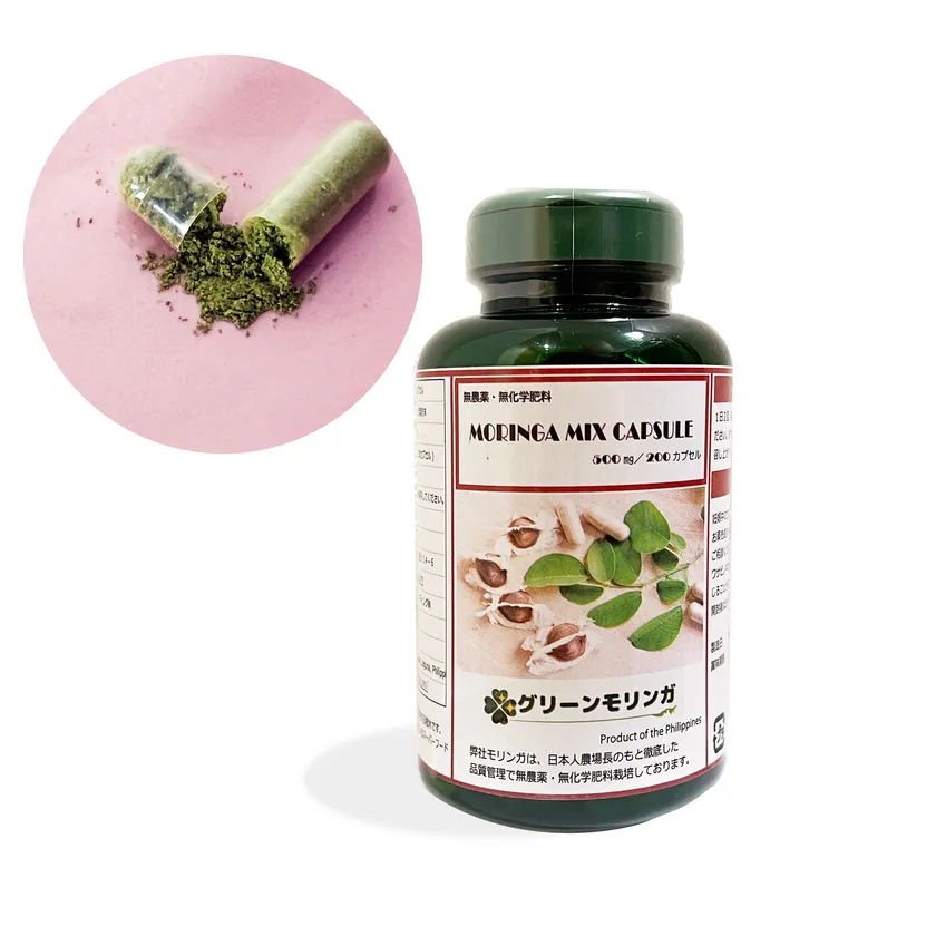 種子乾燥粉末と、有機JAS認証モリンガ葉の乾燥粉末を、それぞれ50%ずつ配合し植物由来カプセル(HPMC)に500mg封入したものです。