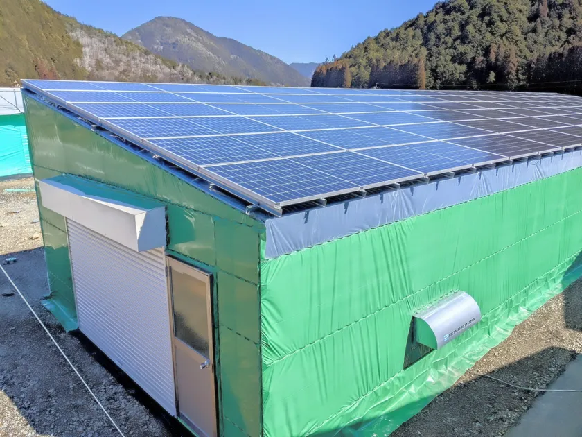 有機営農型ソーラーハウスのモデル施設の外観。有機認証のキノコ栽培と自然再生エネルギーの生産が可能となる