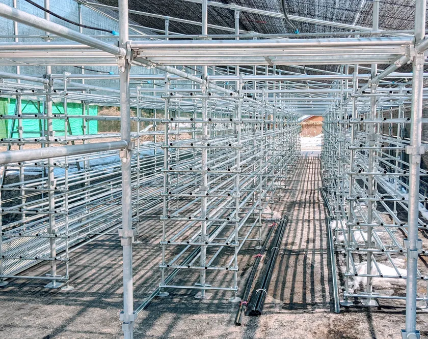 有機営農型ソーラーハウスの施工中の内部。キノコ菌床棚と構造部材を単管パイプで一体化させている
