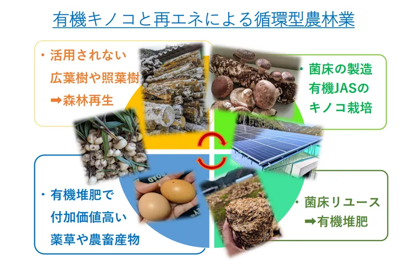 再エネを生み出すソーラーパネル下では、有機認証が取得できる菌床キノコ栽培を中心に、平飼い養鶏や陸稲栽培など地域や事業目的に合わせた営農事業も展開できます。供給が足りない有機農林産物の生産を団地化、企業化することで、大手流通への販路を確保していきます。営農部分を事業地周辺の農業者が担えば、雇用や収入確保につながります。再エネの確保、有機農林産物の生産拡大によって耕作放棄地や遊休農地が再生し、農産物の海外輸出、産地偽装食材の解消、食の安全確保、キノコ菌床原料調達による森林資源の再生へとつながります。