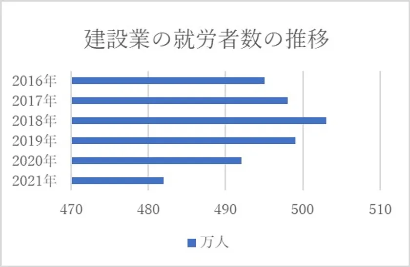 総務省がまとめた2021年の労働力調査の平均結果によると、産業別にみた場合の建設業の就業者数は482万人で前年度比10万人の減少となりました。建設業の就業者数は2016年に500万人を割り込み、2018年に503万人まで回復したものの、再び減少に転じて、3年連続で500万人を下回っています。就業者の高齢化などもあり、慢性的な人手不足が業界の課題となっています。