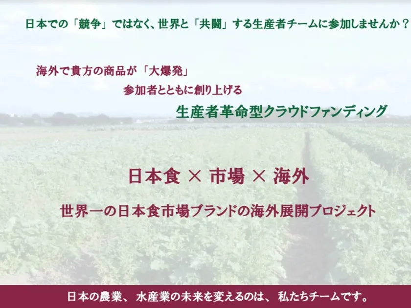 本クラウドファンディングは、日本の生産者様が想いを込めて作った商品を、適正価格で販売するため、海外マーケティングのプロが海外現地に日本食専門市場型店舗を設立し、世界一の日本食販売“ブランド市場”を実現し展開を目指しています。