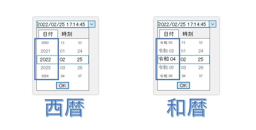 日付時刻コントロール(GcDateTime)のドロップダウン日付時刻ピッカー(DropDownDateTimePicker)で「和暦表示」を設定できるようになります。さらに、「時」、「分」、「秒」の表示有無や、時間間隔の設定が可能です。