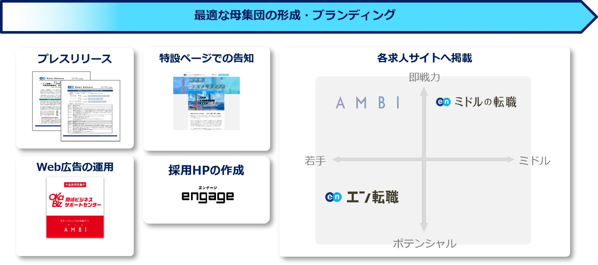 プレスリリースや特設ページ、採用HPの作成、Web広告を用いた告知に加え、各求人サイトでの集客サポートを実施いたします。『エン転職』『AMBI』『ミドルの転職』とターゲットの異なる3つの求人サイトを活用することで、ターゲットへ網羅的に求人を届けます。また、採用ターゲットの策定から選考のアドバイスまで、全面的にサポートいたしました。