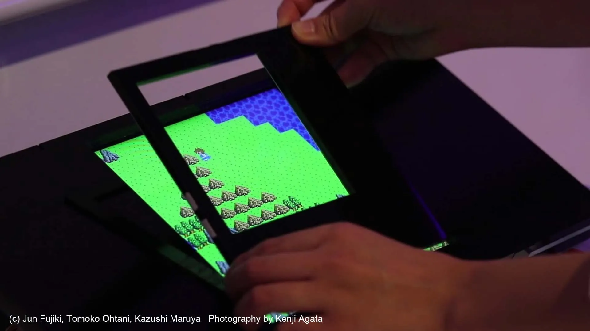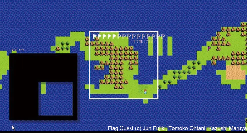 マスクプレートと呼ぶ物理的なインタフェースを使って、フィールドの任意の場所にループ構造を作り出すことで、新しいルートを形成しながらフィールド上の全ての旗を集めていく、レトロ RPG 風見下ろしビューのゲームです。2次元マップ上のキャラクタを操作するゲーム場面を例とし、仮想世界の座標系をユーザの意図にしたがって動的に書き換える、すなわちワープをインタフェースの基本動作に取り入れたシステムです。