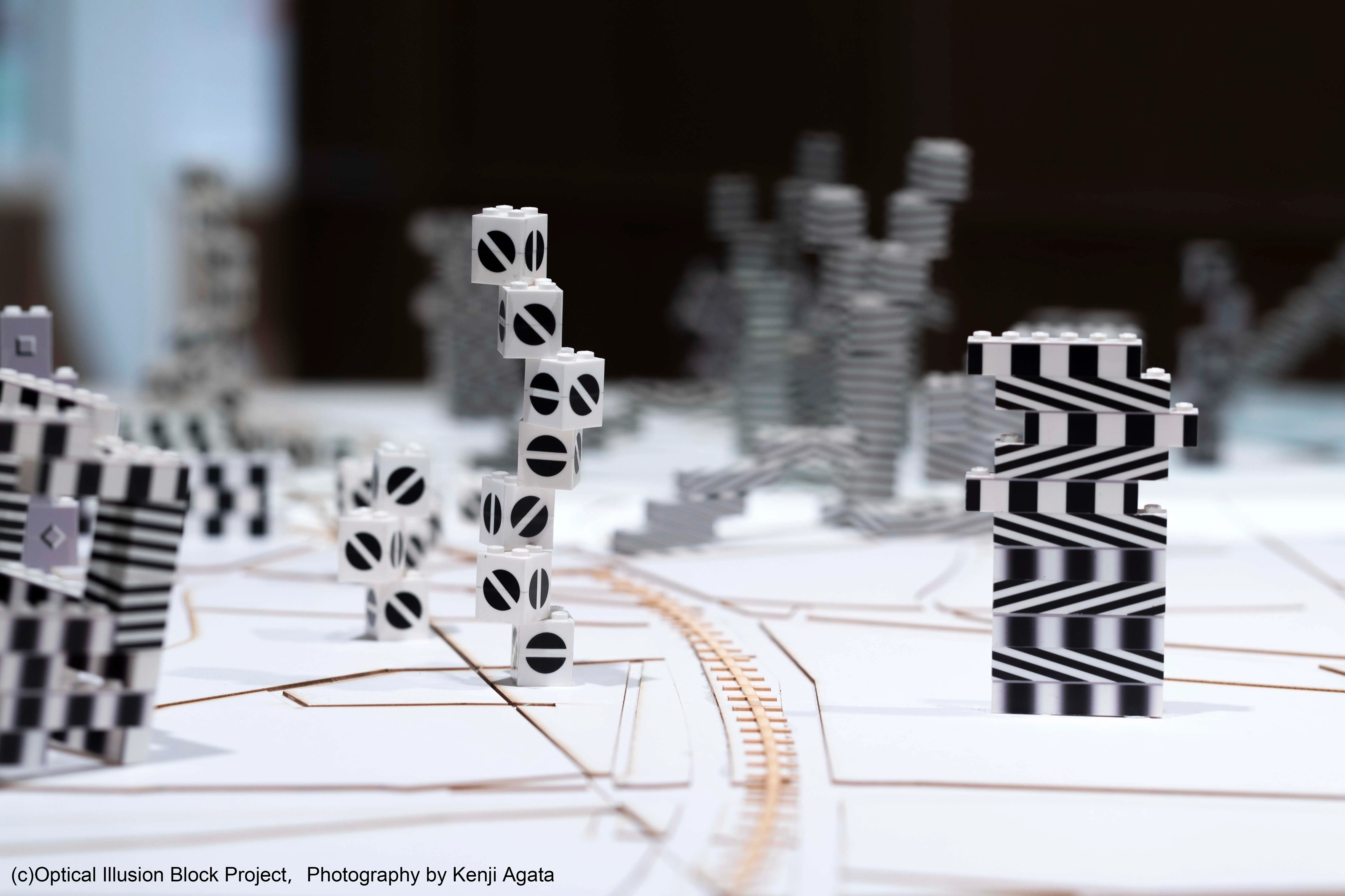 はっきりした白黒の図形が貼り付けられたブロックで組み立てられた立体が、白地図の上に置かれています。見る位置を変えると、錯視の強さも変わります。四角いブロックを使っているので、町の形を正確に捉えることはできませんが、様々な角度や大きさの図形が起こす錯視で、私たちが街に対して感じる雰囲気を表しています。