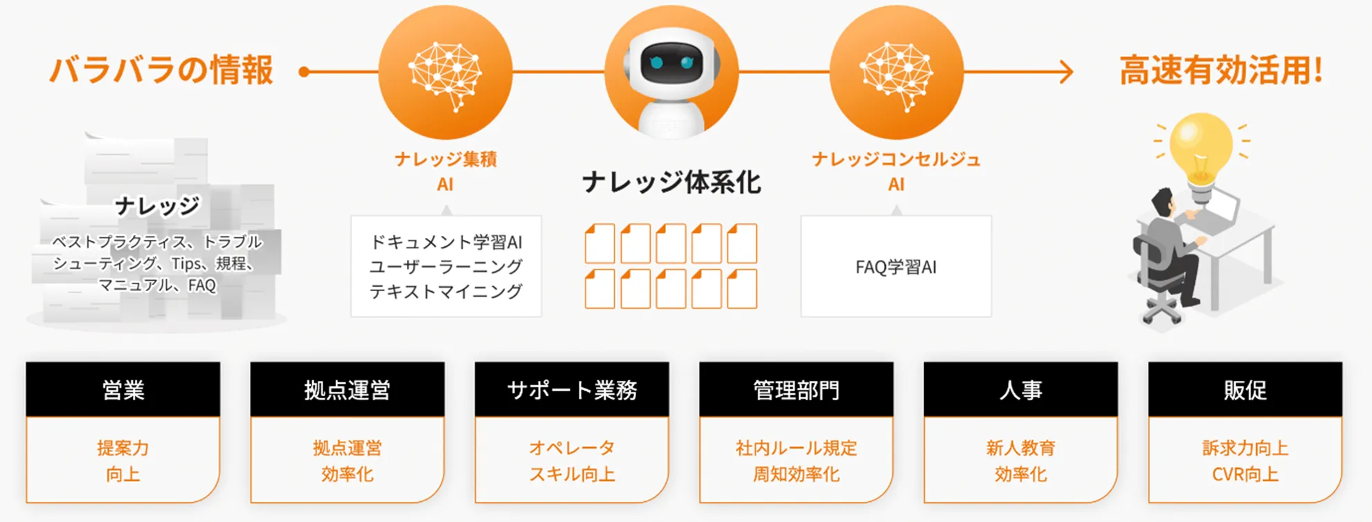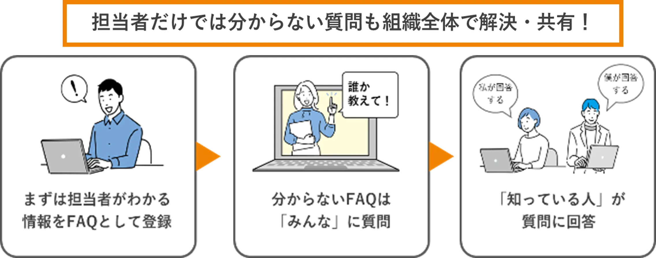 運用過程で不足しているFAQ情報を自動で分析・可視化するサポート機能や、回答が存在しない場合に他のユーザーから情報を収集し展開する機能等、さまざまなAIにより効率的に組織内の業務効率化や自己解決力向上を実現いたします。