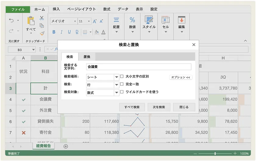 [Ctrl]+[F]キーにより「検索と置換」ダイアログを表示し、ワークシートやブック全体から、任意の文字列を探したり置換したりすることができます。オプション機能により、検索場所や検索対象、「大小文字の区別」や「完全一致」など、より細かな絞り込み条件を指定することも可能です。
