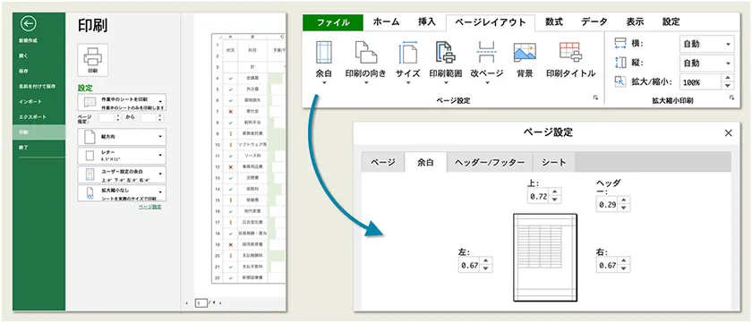 Excelと同じような操作感で、[ファイル]メニューを使った印刷が可能です。リボンメニューには「ページレイアウト」タブが追加され、印刷時の余白や用紙方向、用紙サイズ、印刷範囲、改ページなどを設定できるようになります。ページ設定ダイアログの表示にも対応しています。