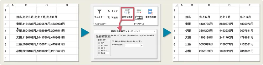 専用のダイアログを使用して、コンマやタブ、スペースなどで区切られた文字列を分割し、個別のセルに表示することが可能です。