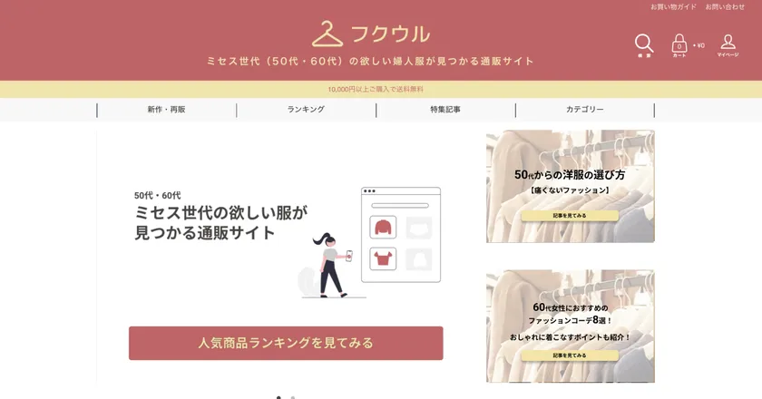 「フクウル」は、50代・60代女性向けのファッション・ファッション雑貨を提供するブランドに絞ったECモールです。この世代向けの様々なブランドを、豊富な選択肢の中からワンストップで見つけて購入できます。「フクウル」では「ブランドの指名買い」や、「商品カテゴリーを絞って、ブランド間を比較してのお買い物」も簡単です。