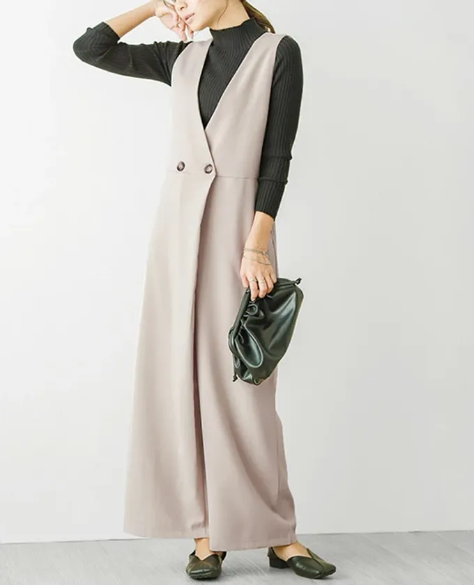 深めのVネックとラップ風デザインがスタイリッシュなオールインワン。さらっとした光沢感のある生地が動くたびに上品なシルエットを演出し、着脱が楽なフロントのファスナーと便利な前後4カ所のポケット付きで機能面もばっちり。体型カバーも叶うゆとりのあるデザインは様々なインナーとの相性も良く、ロングシーズン大活躍間違いなしのリラクシーアイテムです。