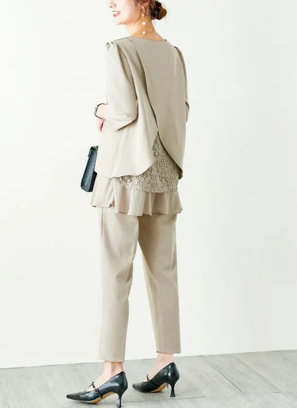 レースとシアーのドッキングデザインが、バックスタイルに華やかさを添える上品な印象のセットアップ。着るだけでお洒落見えするのに、ゆったりとしたサイズ感で楽な着心地は、春に多いオケージョンシーンでも有難いスーツになること間違いなしです。美シルエットが叶うセンタープレスパンツはスタイルアップ効果も。ブラックやネイビーといった王道のカラーの他に、アイスグレーやグレージュのような淡いカラーも揃っており、季節を感じさせる柔らかい雰囲気に仕上げるのもおススメです。