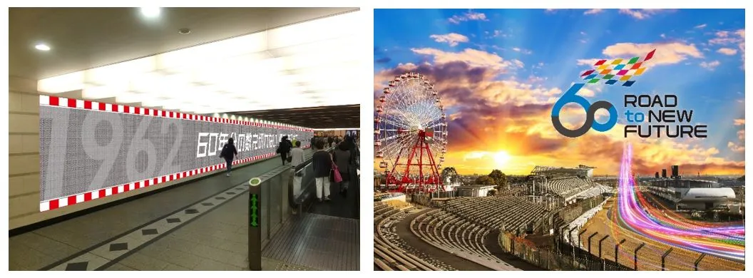 大阪梅田駅から阪急百貨店 阪急うめだ本店へ向かう途中にある、動く歩道を見守るように続く超ロングスケールの交通広告に、鈴鹿サーキット開場60周年の広告を掲出いたします。