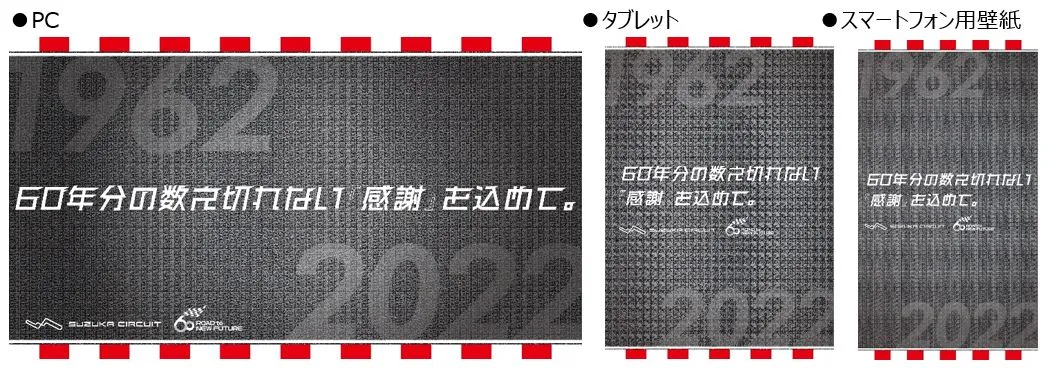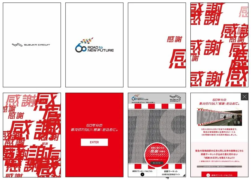 特設サイトにアクセスしていただくと、鈴鹿サーキットのロゴから開場60周年記念ロゴへと切り替わり、メインメッセージ「60年分の数え切れない『感謝』を込めて。」がサーキットのスピード感を連想する動きで登場します。このサイトでは、交通広告と同じデザインの画像がダウンロードできます。