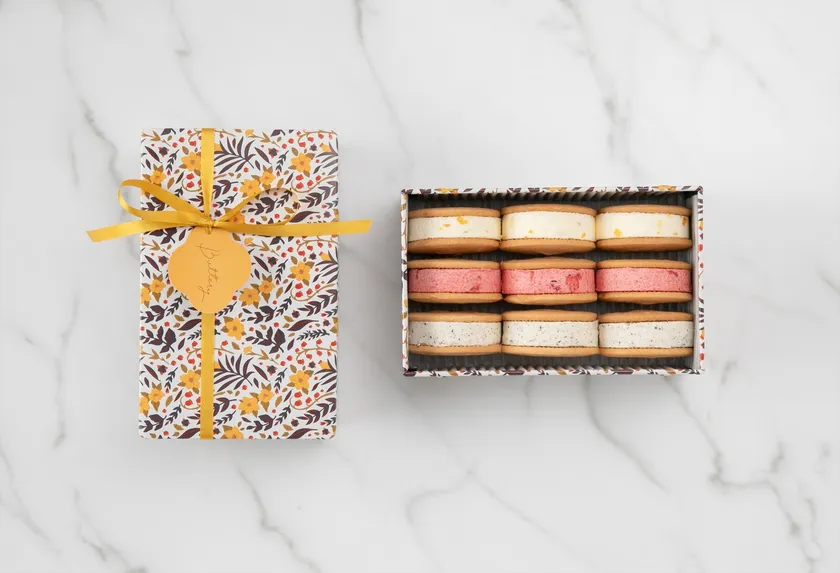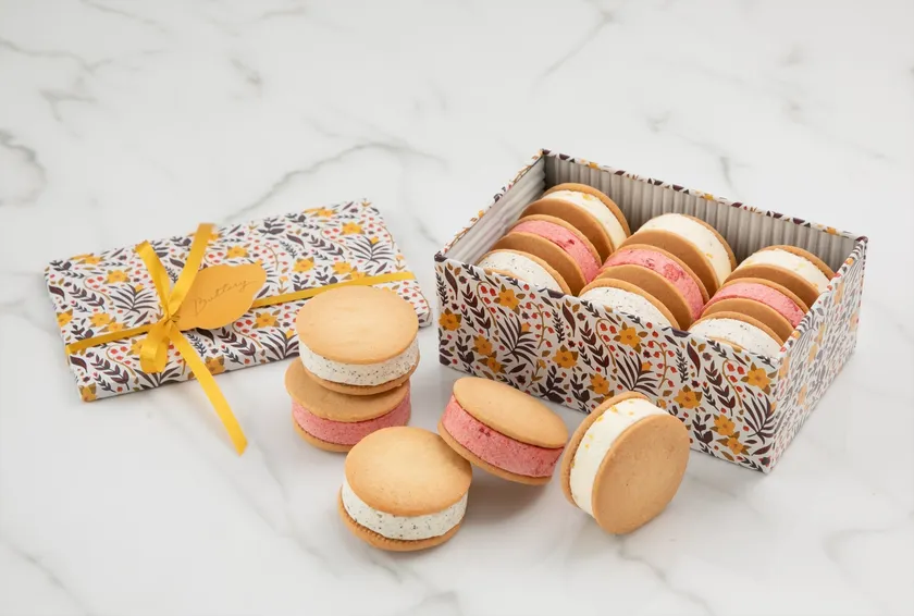 「バタリーサンド」のクッキーには国産発酵バターを使用。Butteryの工房で焼き上げたサクサクとしたクッキーに挟むのは、北海道バターに3種類の新作フレーバーを組み合わせたバタークリームです。柑橘の爽やかさが際立つ「オレンジ」、ストロベリークリスピーやストロベリーチョコレートのザクっとした食感が楽しめる「苺」、茶葉を贅沢に使用した香り豊かな「アールグレイ」。コロンとしたサイズ感が可愛い、春色のバターサンドは、どれも甘すぎず、軽やかな口どけに仕上がりました。また、レトロな花柄に、マスタードカラーのリボンをあわせた、オリジナルデザインのクッキー缶も魅力の1つ。自分へのご褒美にはもちろん、春ギフトとしてもおすすめです。