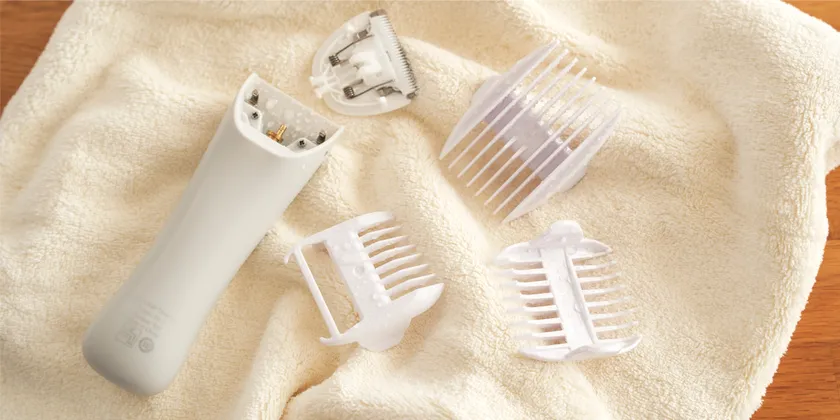 付属のアタッチメントは全部で3種類6段階(斜めカット/0mm・3/6mm・9/12mm)。好みの長さにカットができます。カットが難しい耳周りや襟足のカットもアタッチメントを取り換えるだけなので、楽ちんです。