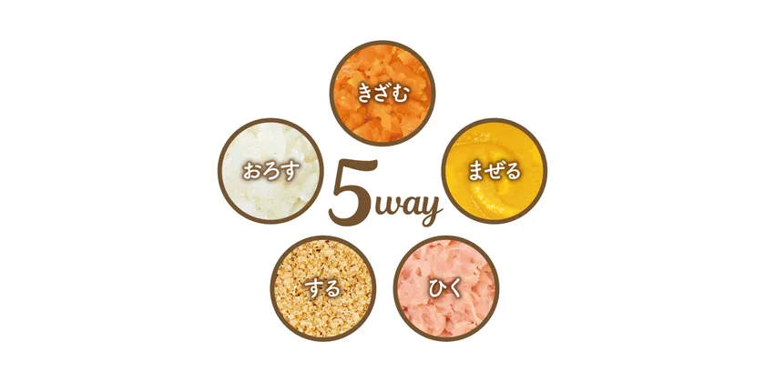 容器を下に押すだけであっという間に細かくなります。撹拌加減は自分で決められるので、離乳食の進み具合や成長に合わせて使えます。1台で「きざむ・おろす・まぜる・する・ひく」の5つが調理できるので、料理のレパートリーが増えること間違いありません。