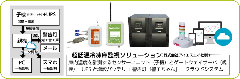 「超低温冷凍庫監視ソリューション」は、コロナワクチンを保管する冷蔵庫、冷凍庫、超低温冷凍庫(ディープフリーザー等)における温度異常や電源異常の監視を行い、停電、機器の故障や不具合、人為的トラブルなどによるワクチン廃棄事故の未然防止に寄与するシステムです。LoRa無線データ計測システム「WD100(製品名:ももことあやか)シリーズ」を応用し、自動監視と自動通報、そして自動で非常用電源へ切替を行う徹底した自動化システムで、管理者の負担を減らし、安全で確実な対応が可能になります。