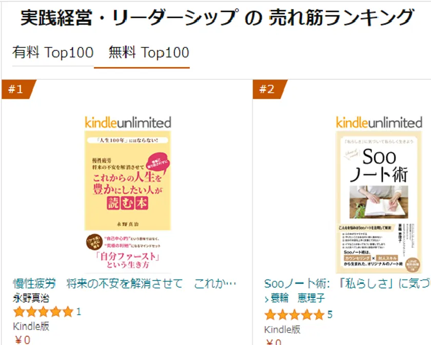 ビジネス・経済部門の「実践経営・リーダーシップ」「メンタリング・コーチ」「意思決定・問題解決」「自己啓発」、暮らし・健康・子育て部門の「家庭医学・健康」「生活情報」、「投資・金融・会社経営」と幅広いジャンルのカテゴリーでランキング1位を獲得。