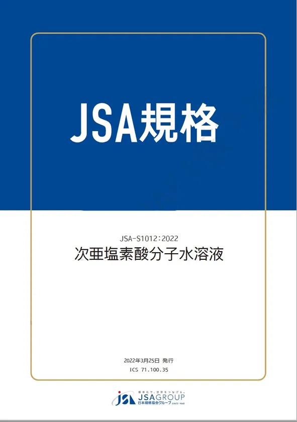 日本初※1「一般市販の次亜塩素酸水」の規格が JSA規格開発制度に基づき、 JSA-S1012:2022『次亜塩素酸分子水溶液』として 発行されました。